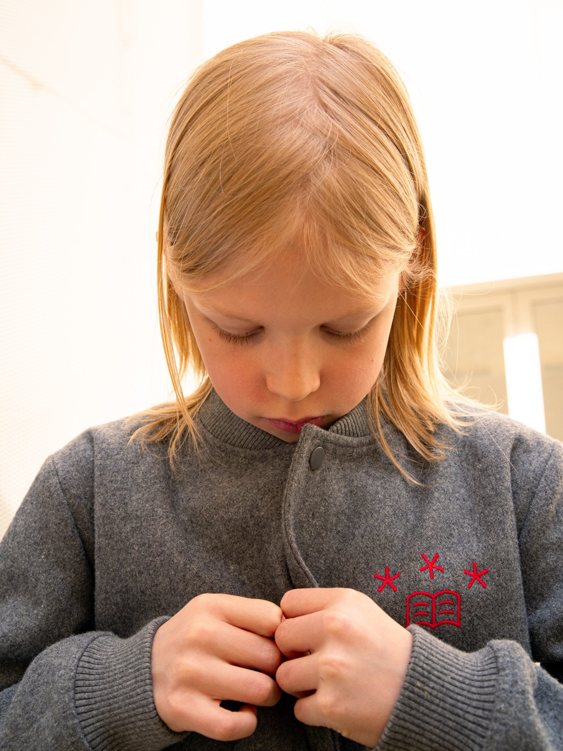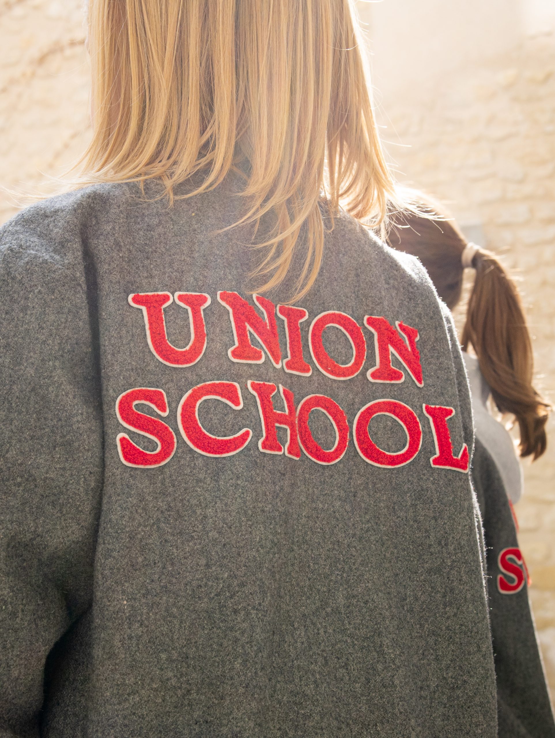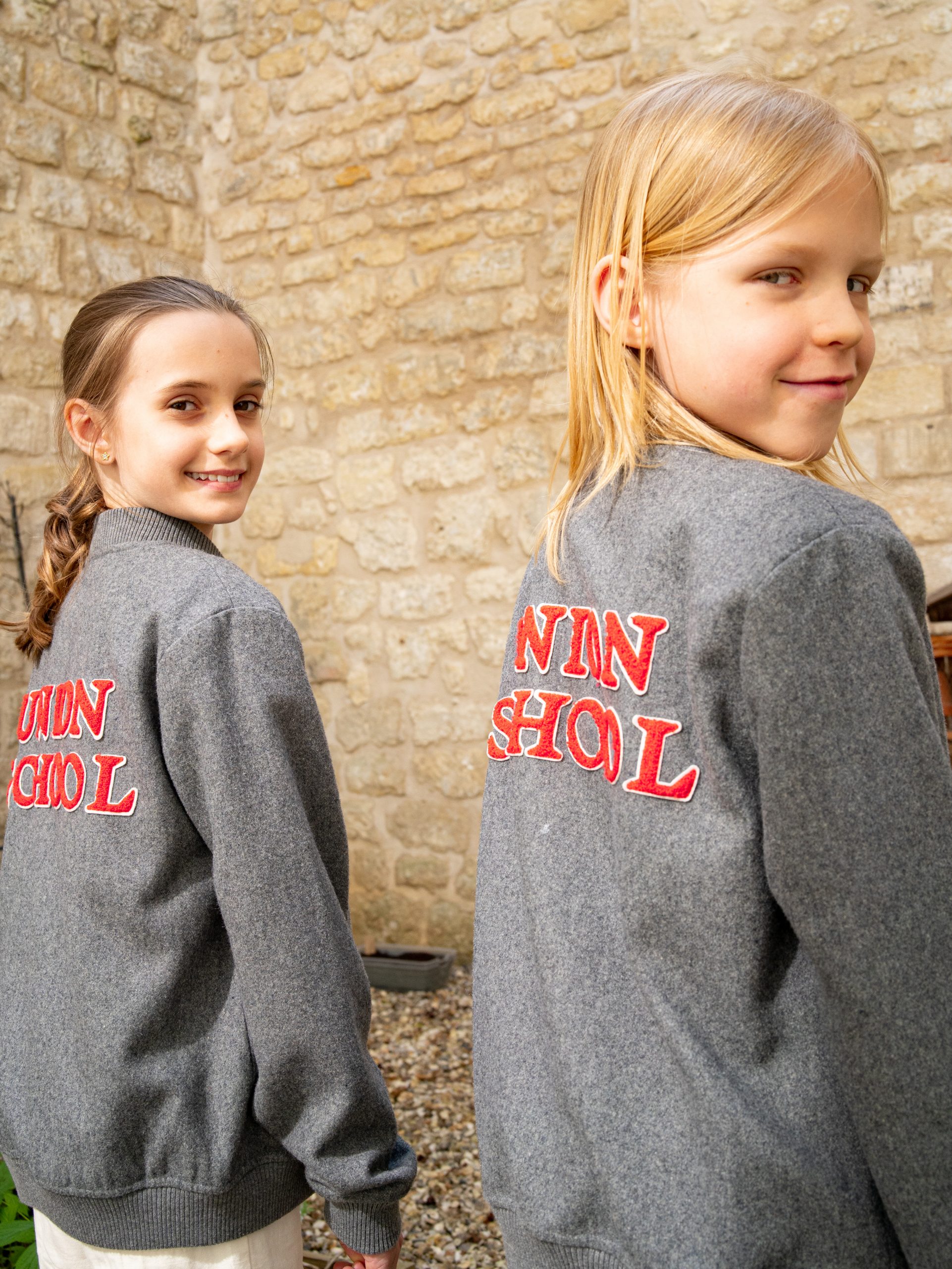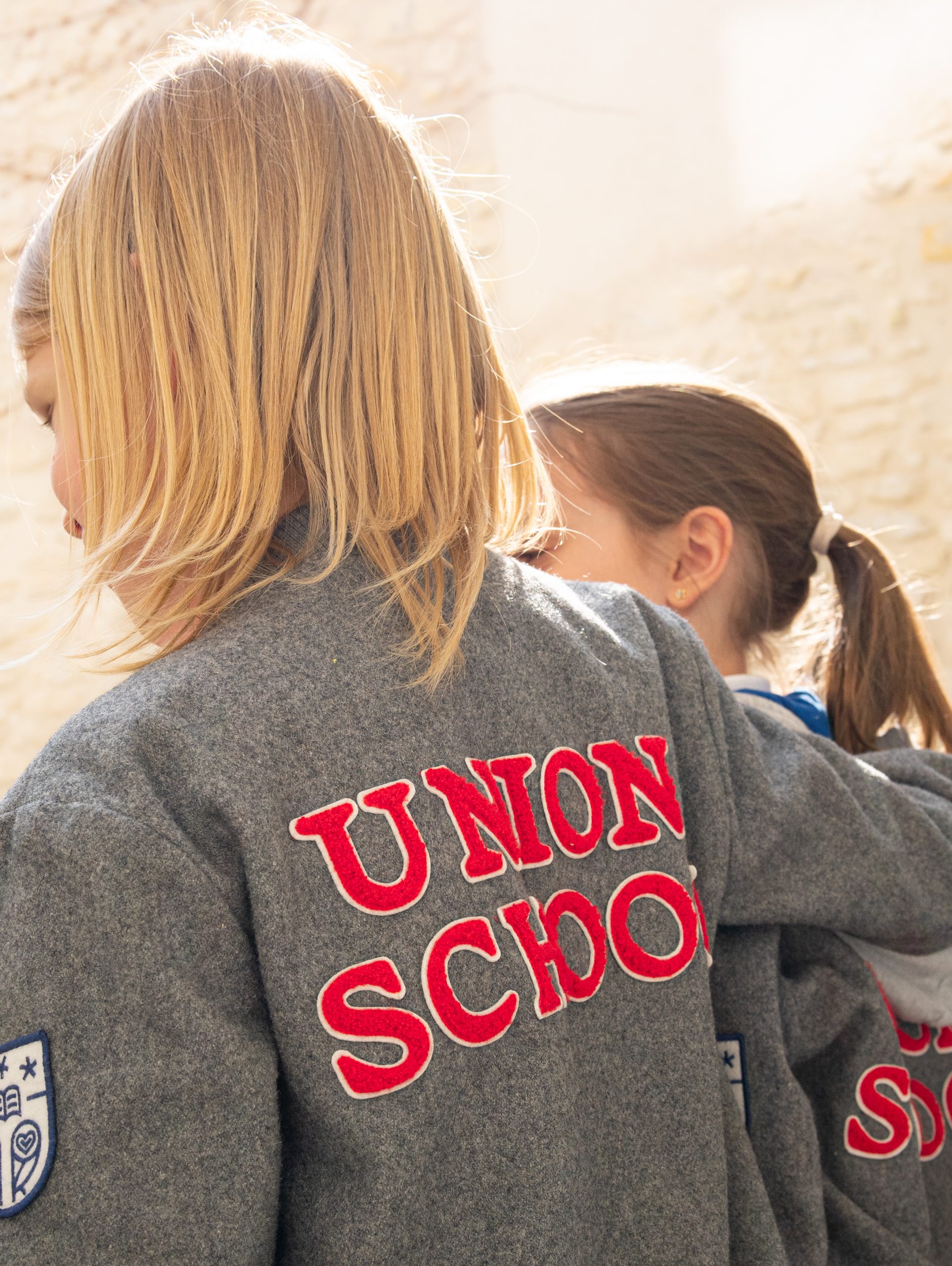 En flanelle grise, ses poches sont soulignées d’un gris légèrement plus foncé. Il est doublé de polaire. On y retrouve tous les éléments de l’héraldique et des couleurs Union School, le blason sur le bras gauche, les étoiles et le livre brodés de rouge sur le cœur, et le nom de l’école de vos enfants à porter fièrement sur le dos.